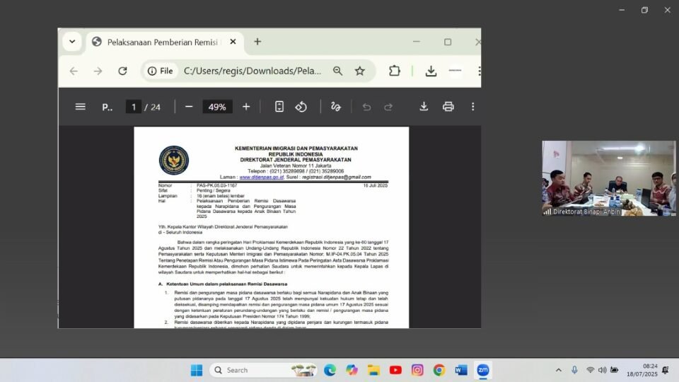 mirandapos.com, Pekanbaru – Lembaga Pemasyarakatan (Lapas) Kelas IIA Pekanbaru mengikuti kegiatan Sosialisasi Pelaksanaan Usulan Remisi dan Pengurangan Masa Pidana, yang dilaksanakan oleh Direktorat Jenderal Pemasyarakatan melalui Direktur Pembinaan Narapidana dan Anak Binaan, Yulius Sahruzah, pada Jum’at (18/07/2025).