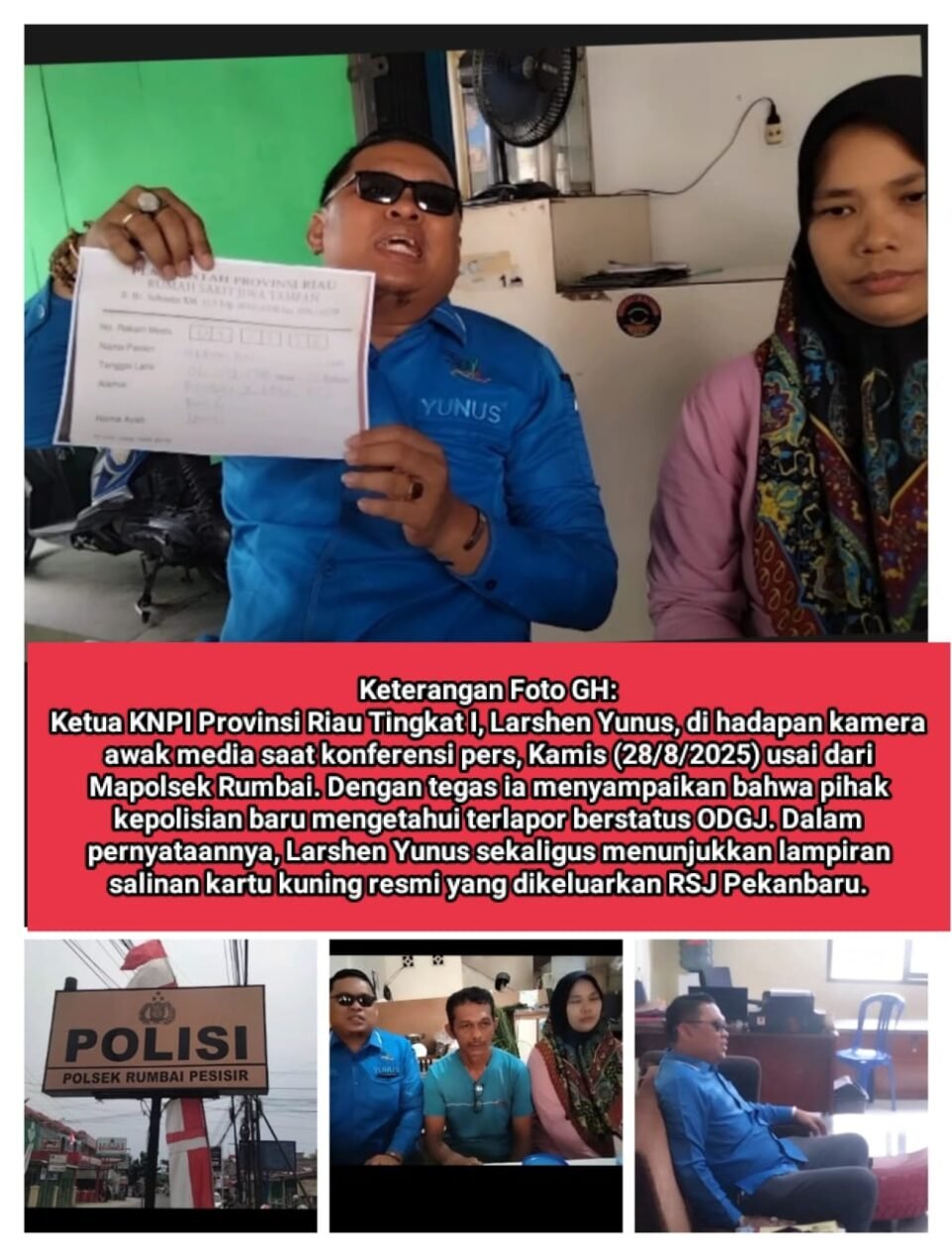 “Hari ini kami bersama abang kandung dan istri saudara Sepria Andiko alias Diko, seorang ODGJ yang saat ini justru dipenjara oleh Polsek Rumbai Pesisir. Para penyidik benar-benar telah melanggar Pasal 44 KUHP dan diperkuat Pasal 39 UU Nomor 1 Tahun 2023, yang jelas menyebut ODGJ tidak boleh dipenjara!” tegas Larshen Yunus lantang di depan awak media.