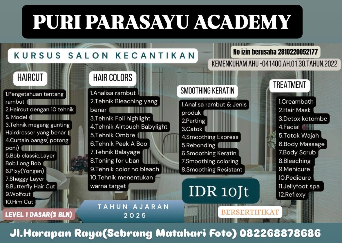 mirandapos.com, Pekanbaru, 28 April 2026 – Puri Parasayu merupakan tempat kursus salon terbaik di kota Pekanbaru saat ini. Kursus ini beralamat di jalan jalan Imam Munandar No 269 kelurahan Tangkerang Timur kecamatan Bukit Raya Kota Pekanbaru, Riau.