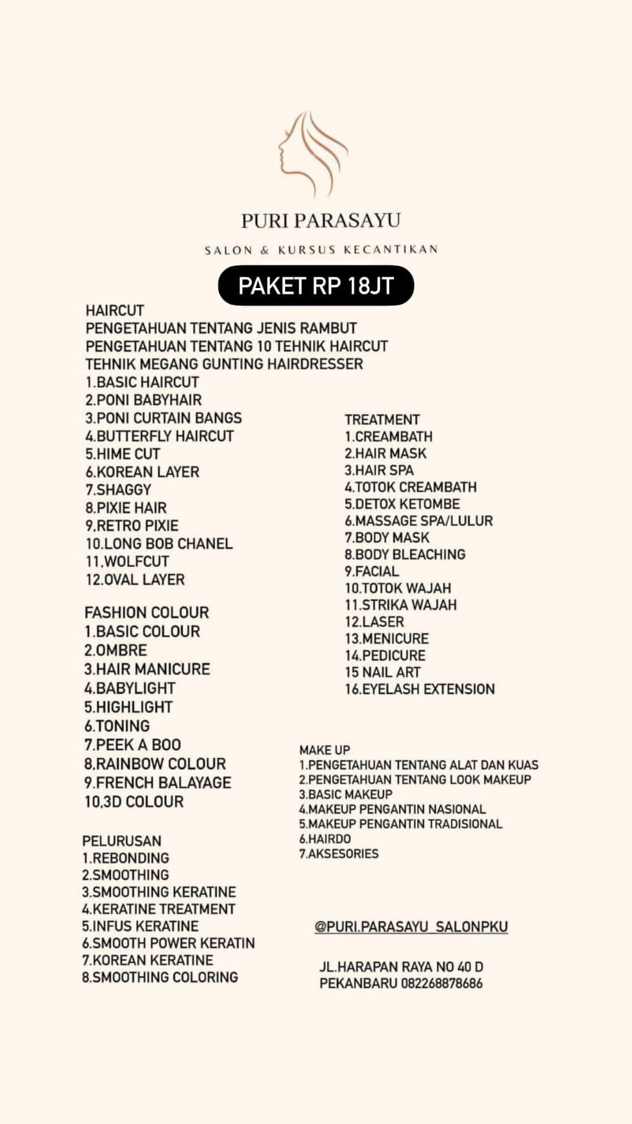 ” Kami menyediakan berbagai macam paket kecantikan mulai dari yang terendah Rp.5.000.000 Hingga Rp.51.000.000. dan belajar tergantung dari paket nya